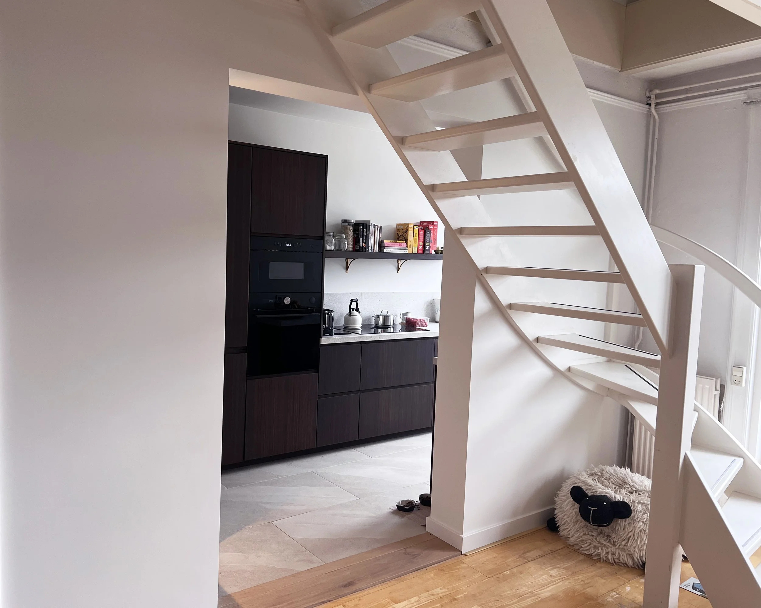 Op de Rooseveltlaan hebben wij een nieuwe keuken gerealisseerd. Er moest een doorbraak komen onder de trap, in de draagmuur om zo een open keuken te maken.